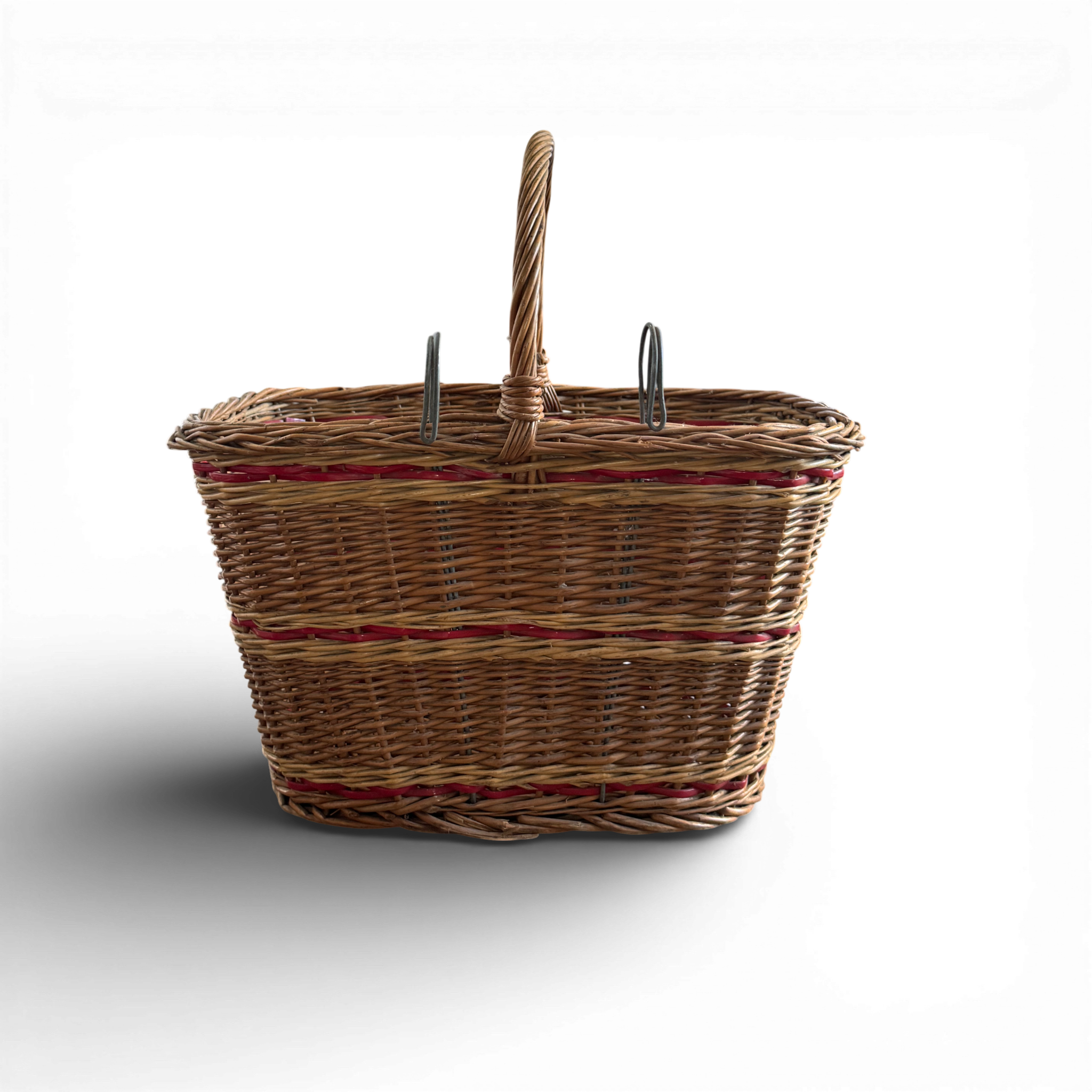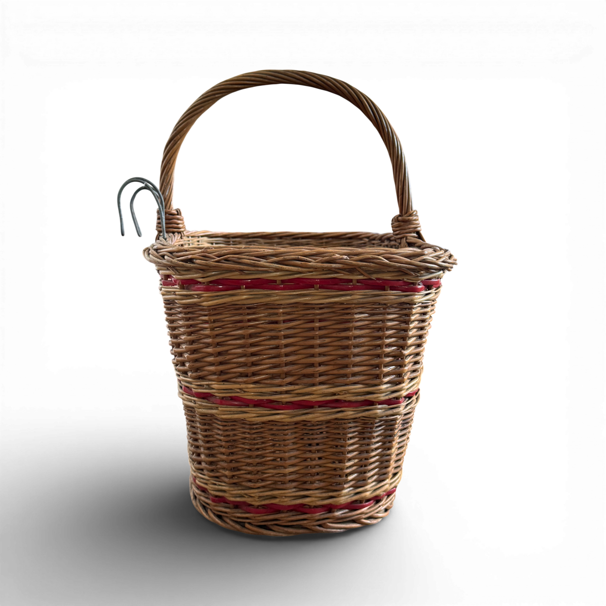 This 1970s vintage wicker basket, sourced in Budapest, features handwoven construction with bicycle hooks. Each basket is one of a kind, showcasing subtle variations in weave, tone, and form that reflect its handmade origins.
