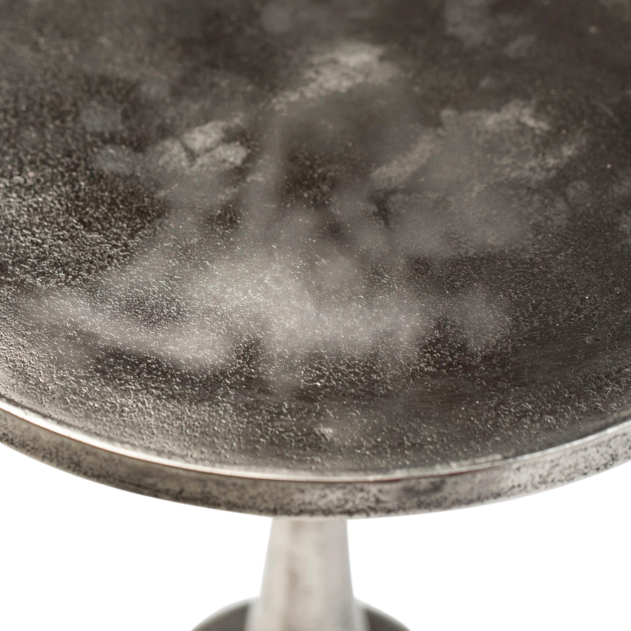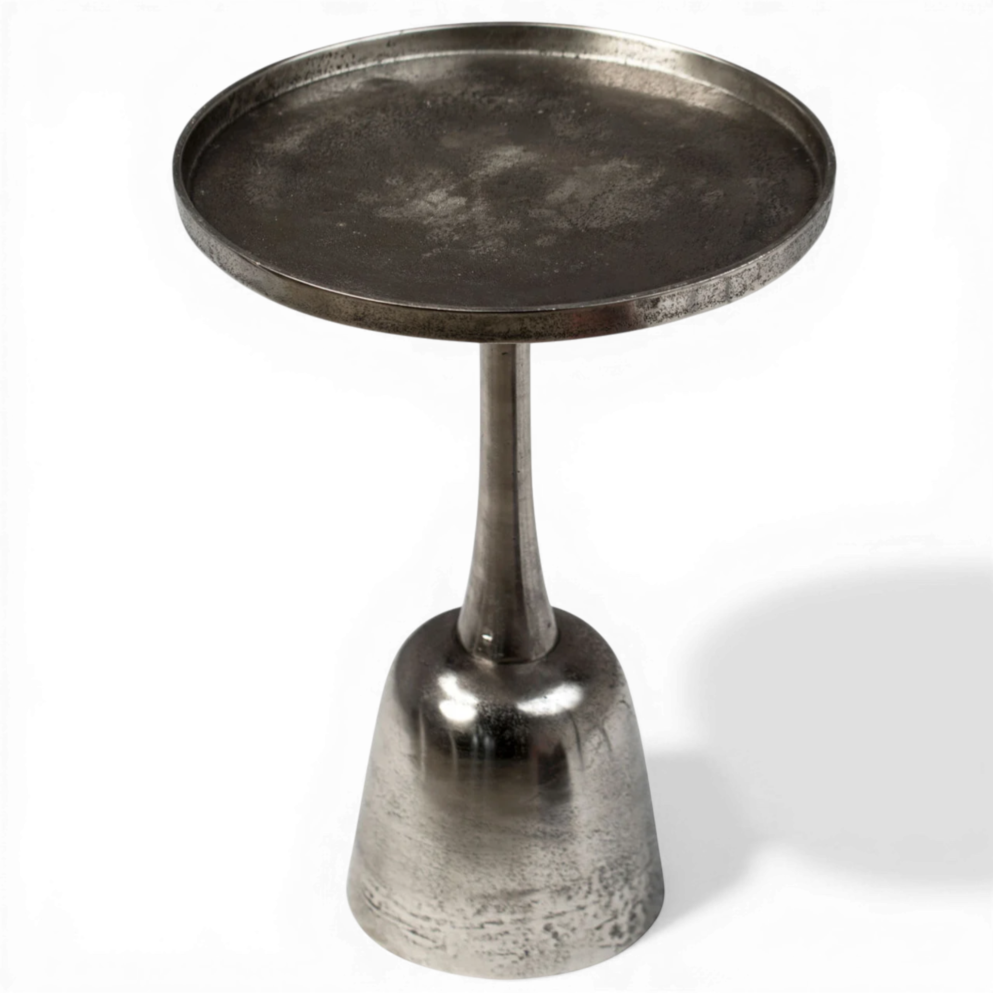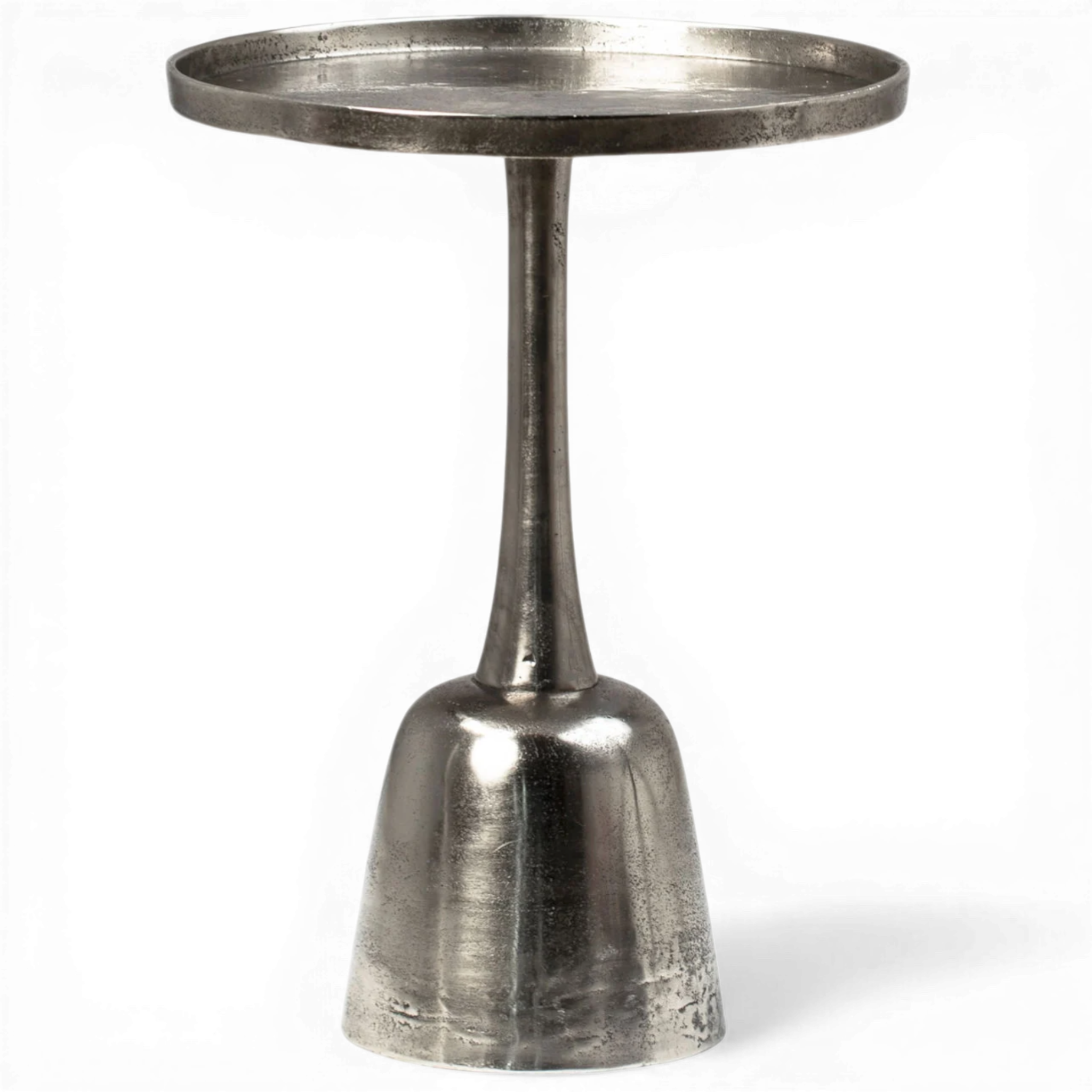 A contemporary aluminum side table defined by its sleek, sculptural form and understated industrial style. The piece features a circular tray-style top with a subtle raised edge, ideal for holding drinks, books, or decorative objects.