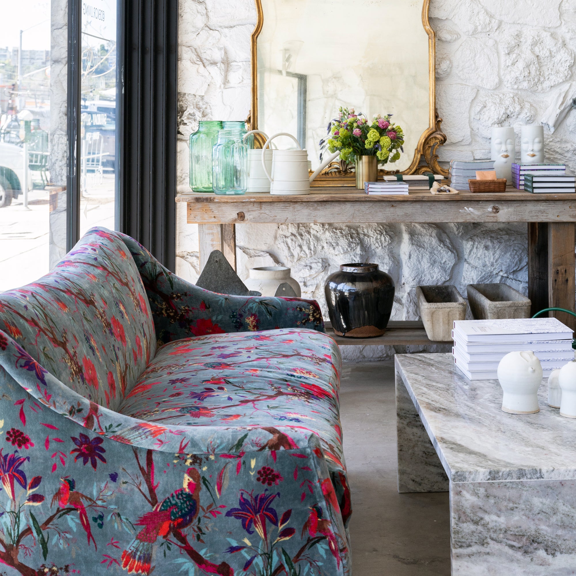 Our Lola is pictured in a one of a kind unique vintage fabric no longer available but it is available to make in COM or our other custom sofa fabrics.