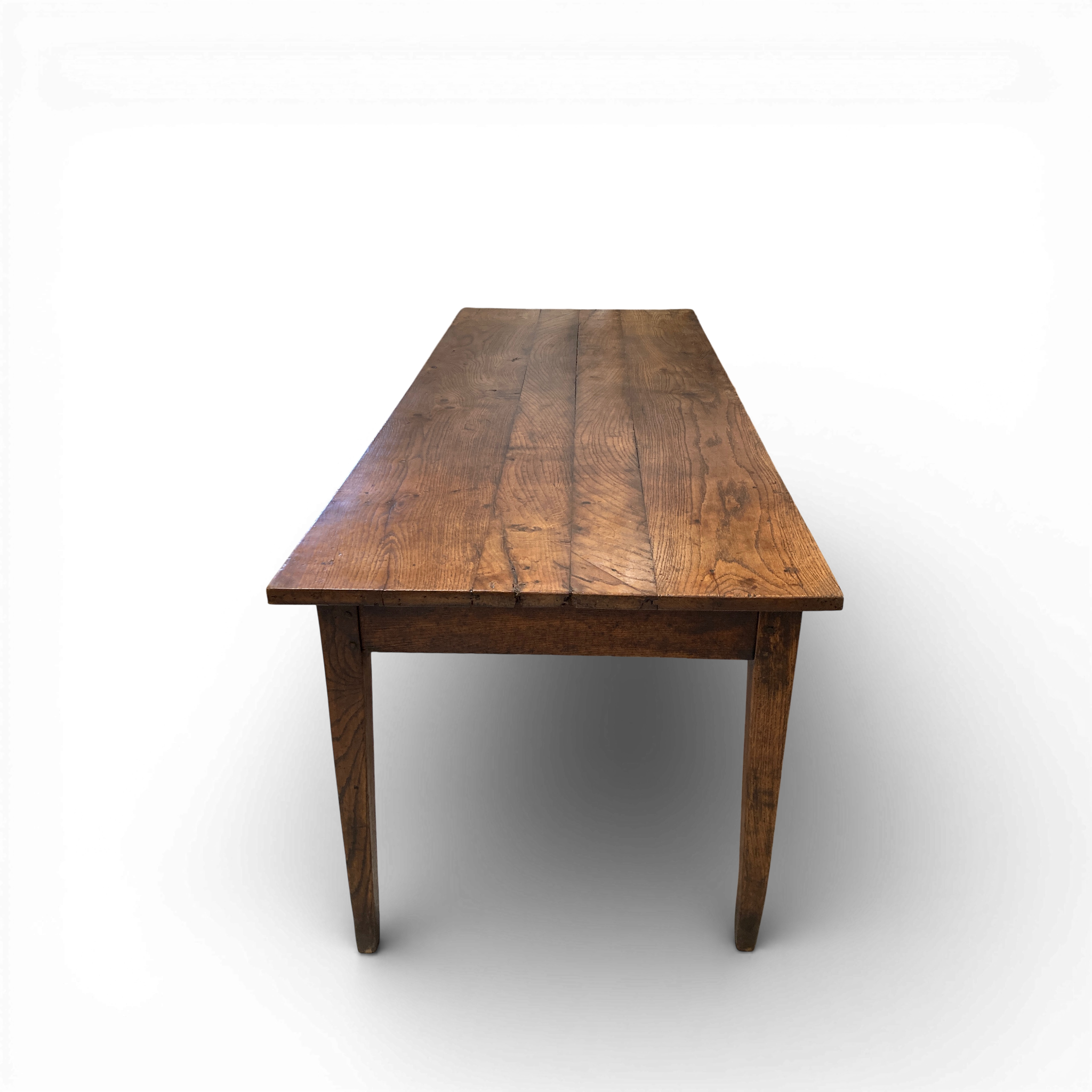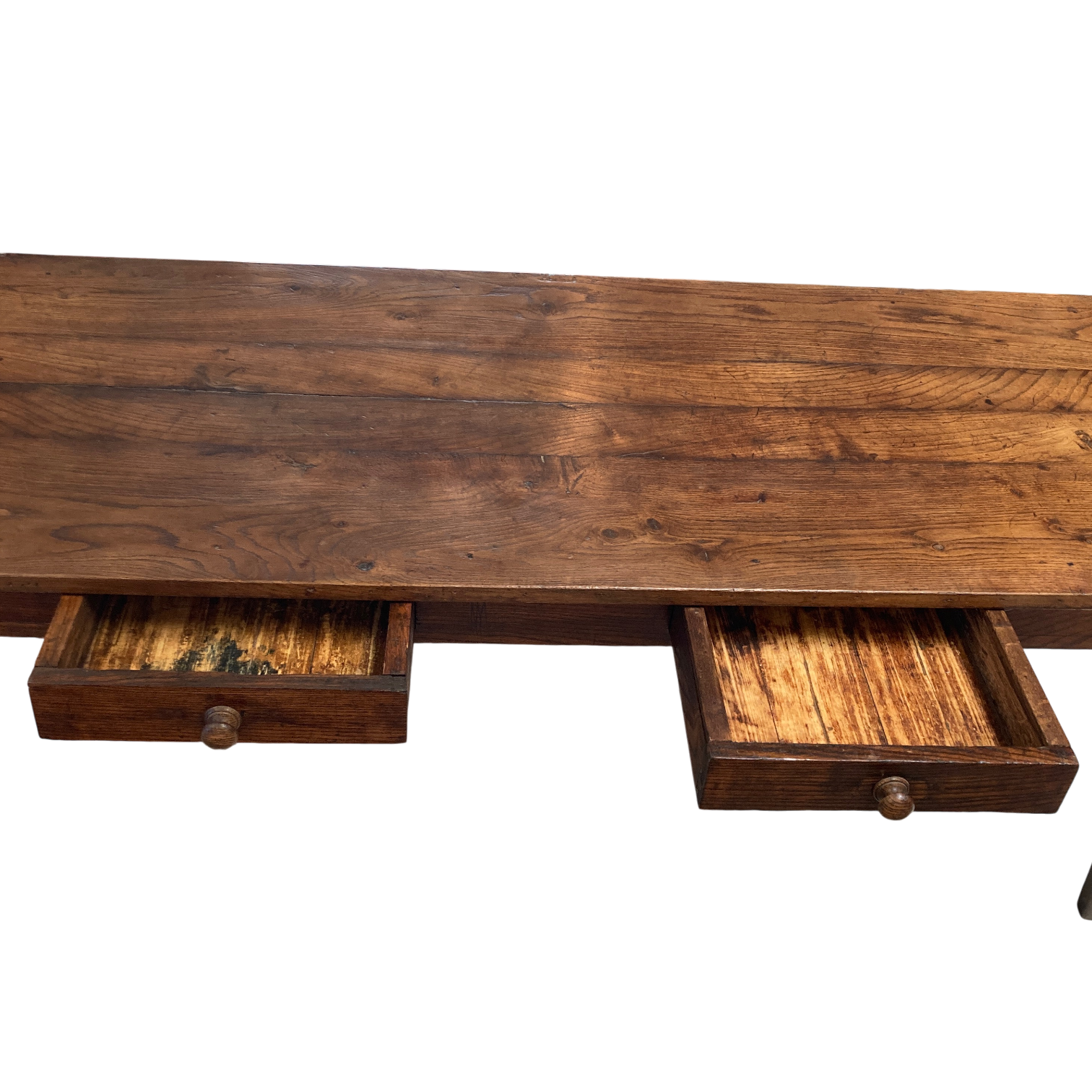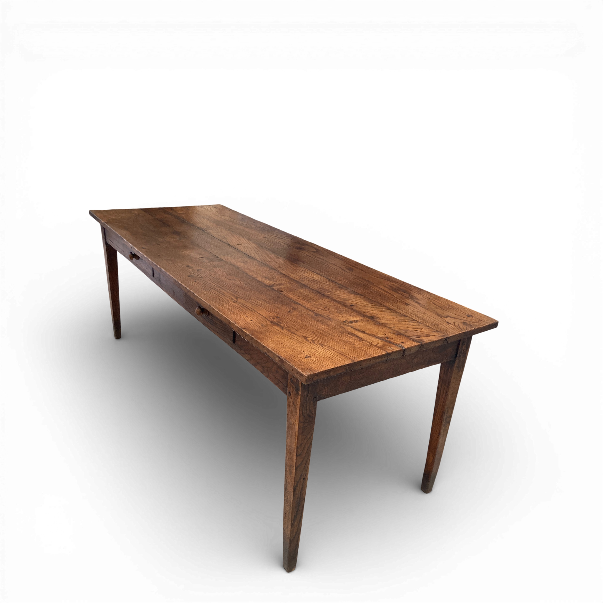 A 19th-century French oak dining table from the storied region of Aubusson, France. Crafted with clean, tapered legs and a beautifully aged plank top, the piece features two functional side drawers—making it equally suited as a dining table, writing desk, or versatile work surface. In great condition with warm patina and light, normal wear consistent with its age, this table offers enduring charm and authenticity for both modern and traditional interiors.