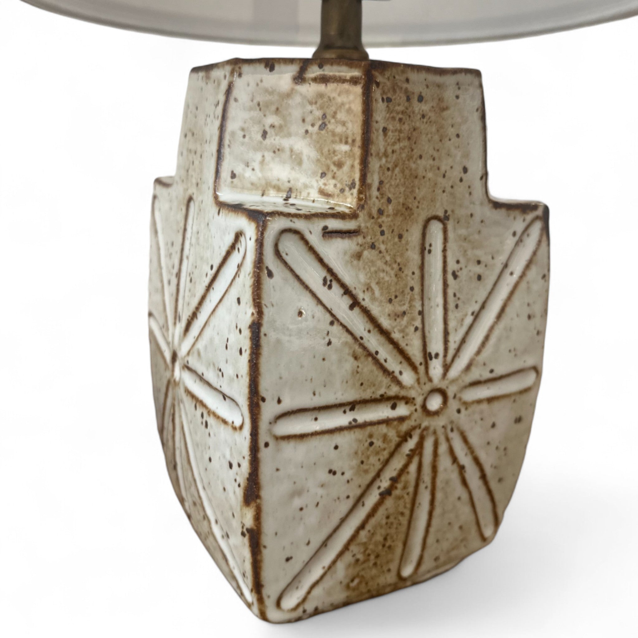 This handmade ceramic lamp features a sculptural base with a starburst motif and a warm, speckled glaze that highlights its earthy, organic charm. Topped with a simple linen shade, it adds a touch of vintage-modern elegance to any room. Two available.