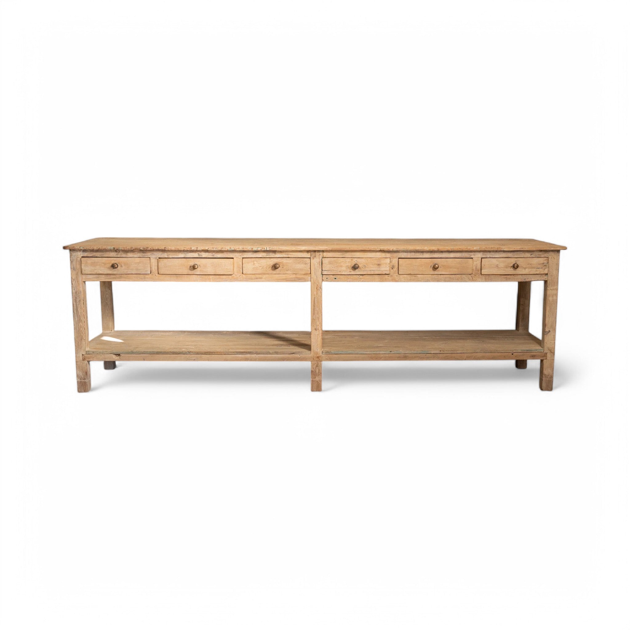 A stunning vintage teak wood island with a naturally weathered finish, featuring six drawers for storage and a lower shelf for open display. Its generous length and rustic charm make it a versatile piece, perfect as a kitchen island, console, or workspace. A timeless addition that blends functionality with character.