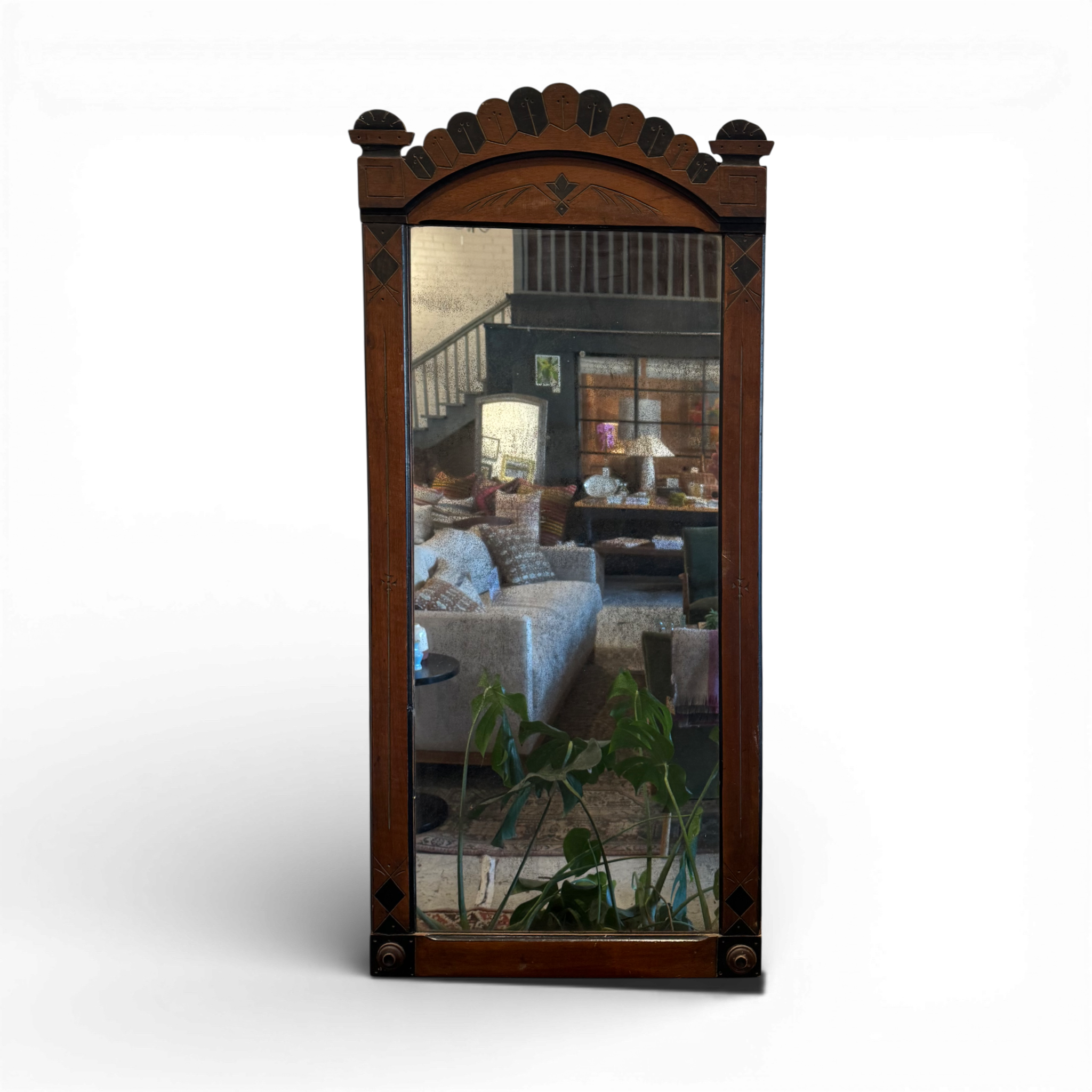 This striking antique mirror features a richly detailed wooden frame with hand-carved and inlaid decorative elements, showcasing the craftsmanship and ornamental sensibility of the late 19th to early 20th century. The arched crest is accented with geometric motifs and layered detailing, lending the piece a strong architectural presence while maintaining balanced proportions.
