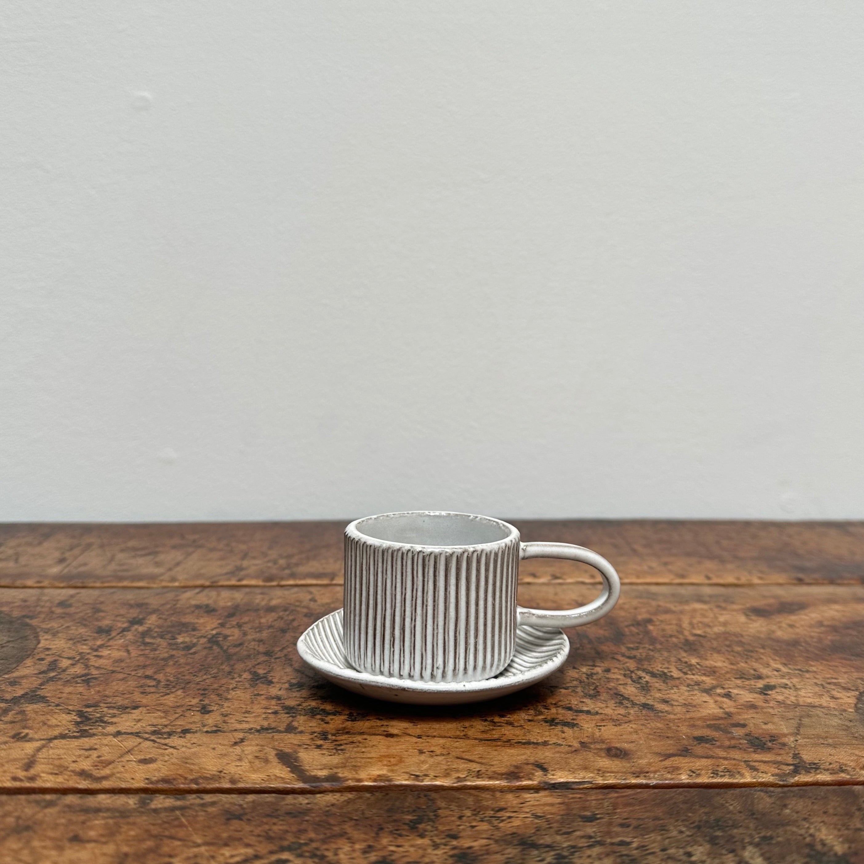 This handmade Italian espresso cup and saucer set brings a refined charm to your daily coffee ritual. Crafted in Modena, Italy, each piece features a textured ribbed design and glossy white glaze that adds a subtle, organic elegance to the table. Made from glazed stoneware, it's both microwave and dishwasher safe, though handwashing is recommended to preserve its beauty. Due to its handmade nature, slight variations make every set unique.