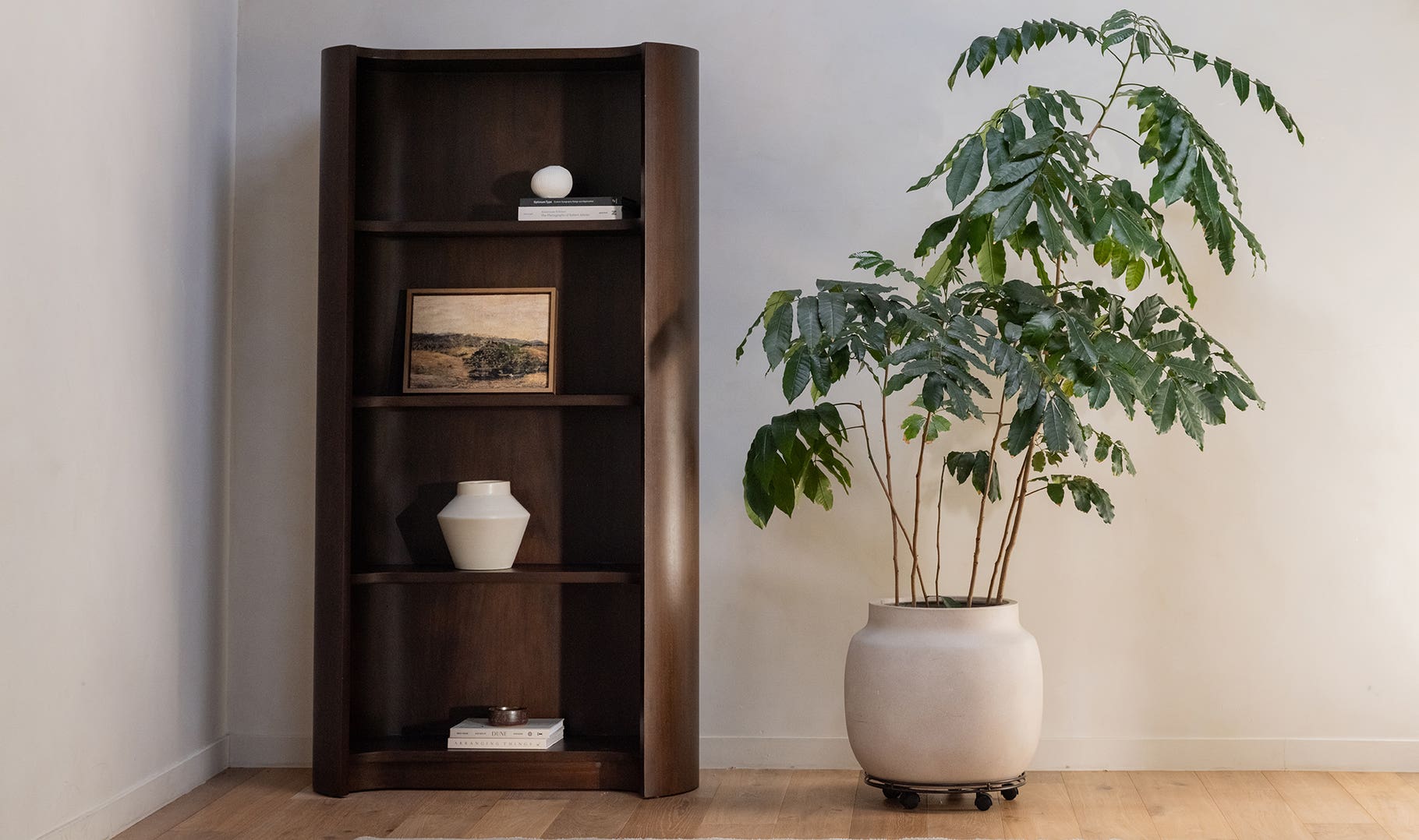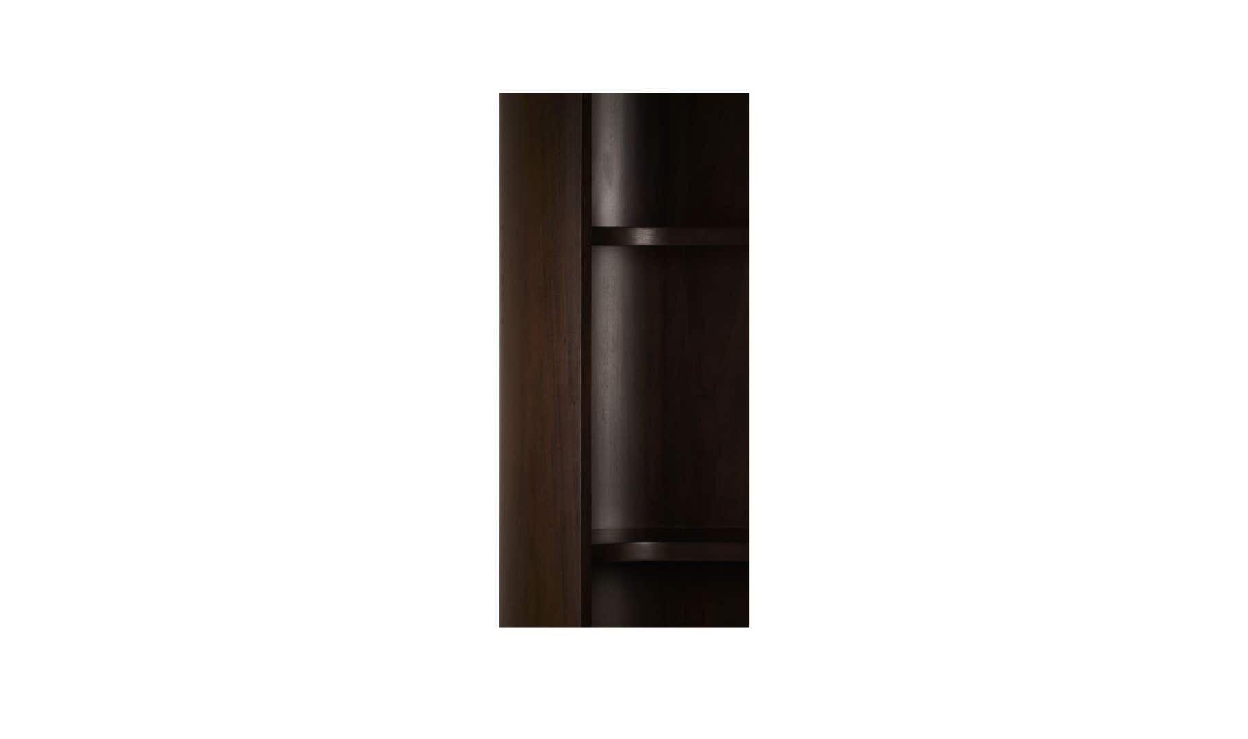 Storage that deserves to be displayed. Nera softens the standard bookshelf silhouette with sculptural curves and a warm mahogany finish. Rounded sides and gently arched shelves mirror each other for a cohesive, elevated look. With four spacious tiers and a design that feels just as thoughtful empty as it does filled, it’s functional, foundational, and totally shelf-assured.