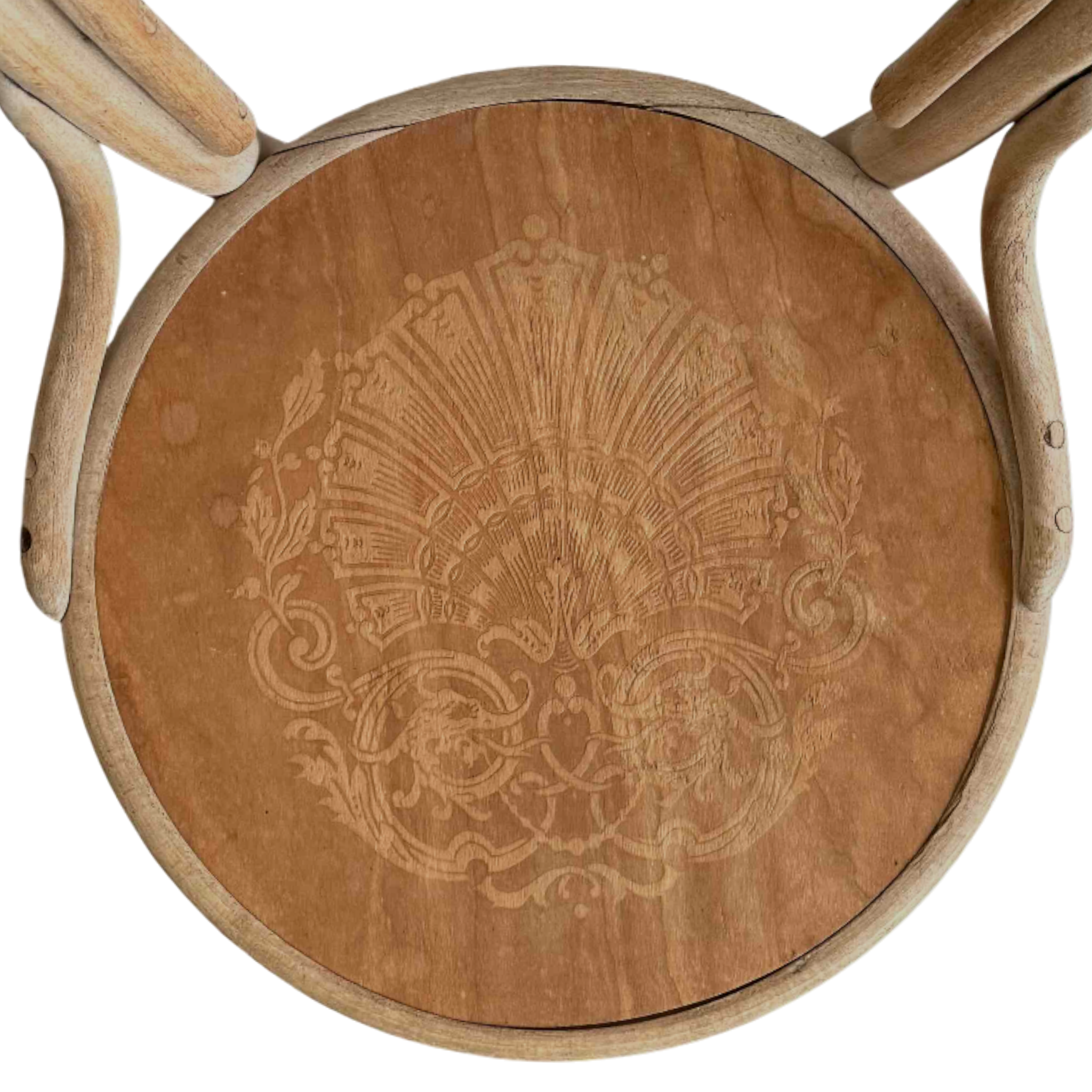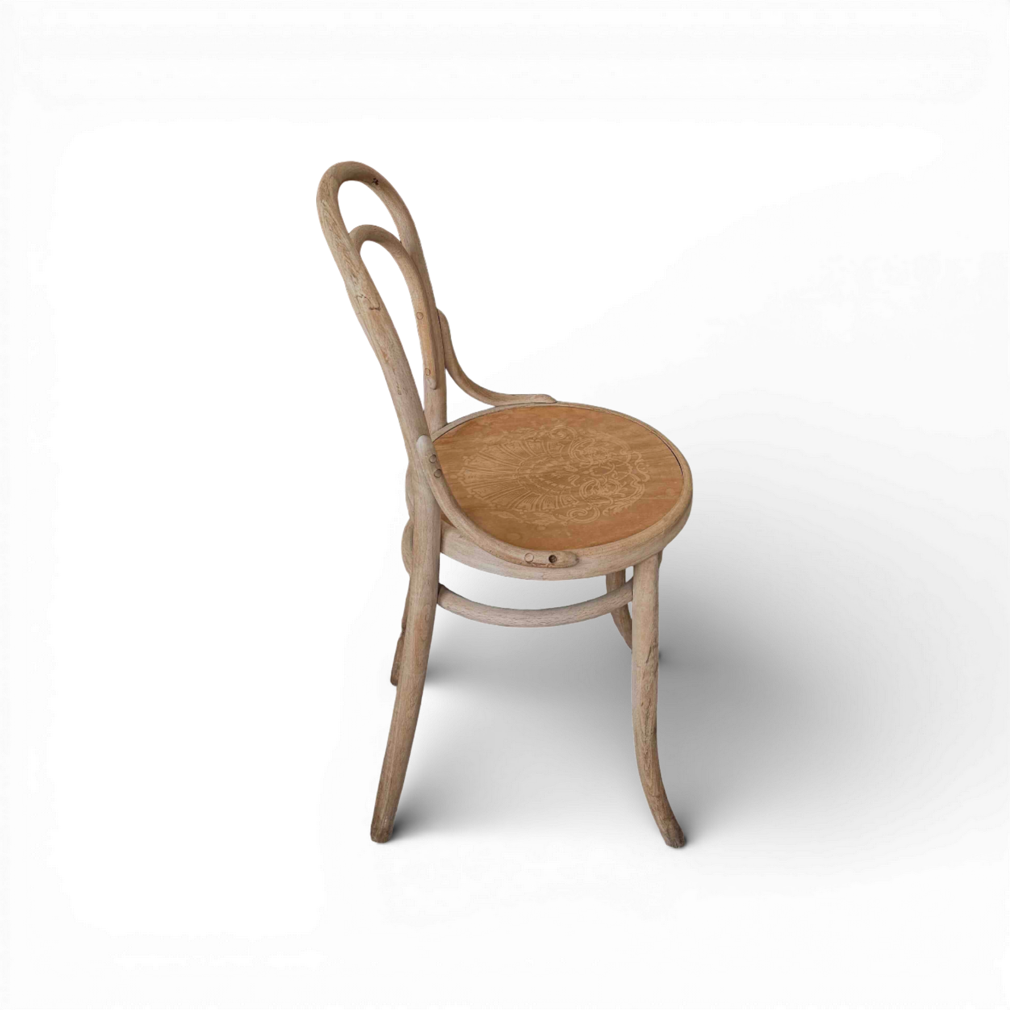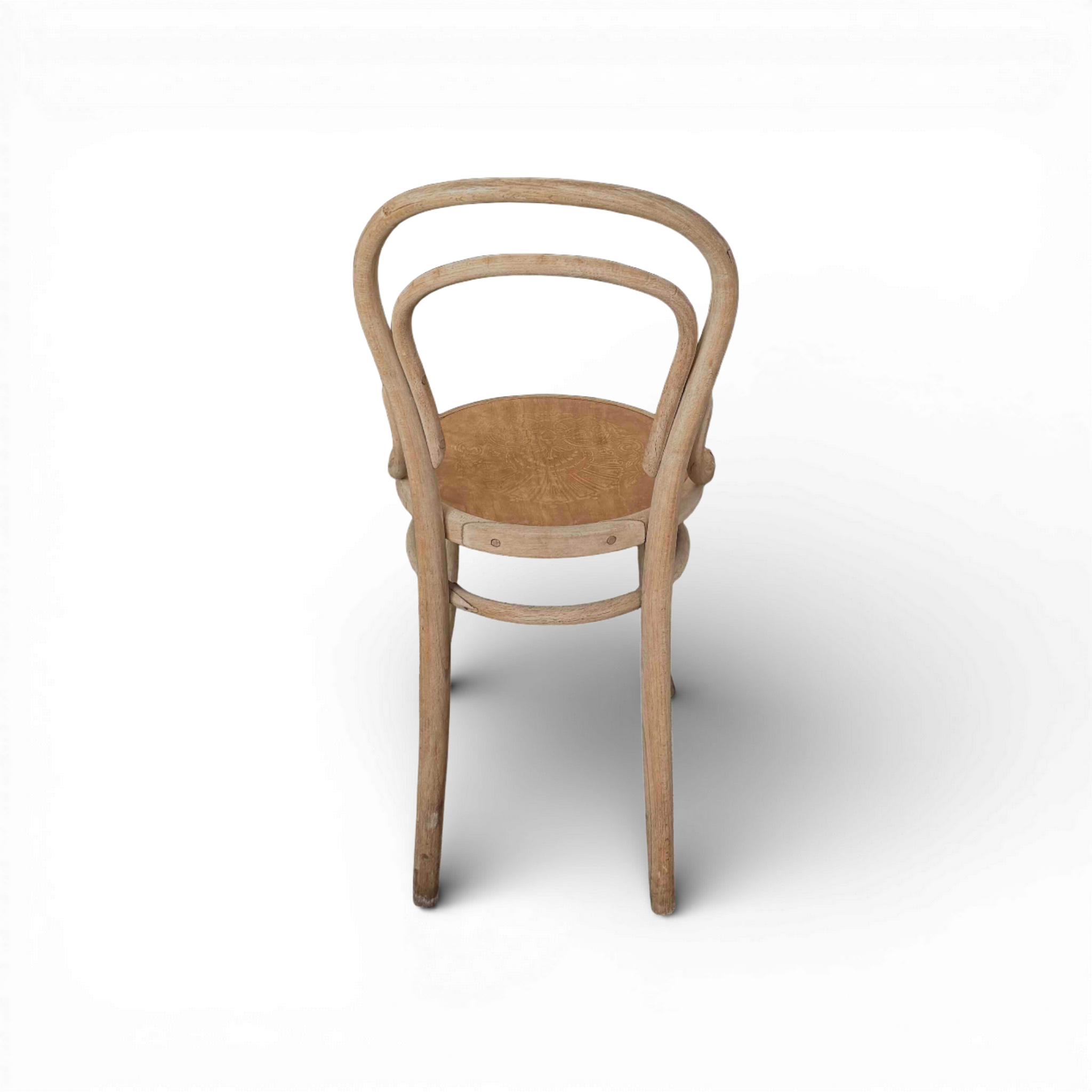 The iconic looped backrests flow seamlessly into slender legs, creating a refined silhouette that feels timeless and architectural. The round wooden seats are richly patinated, displaying delicate surface wear and natural grain variations that speak to their age and authenticity. Subtle incised detailing adds a quiet decorative touch without detracting from the chairs’ clean, sculptural lines.