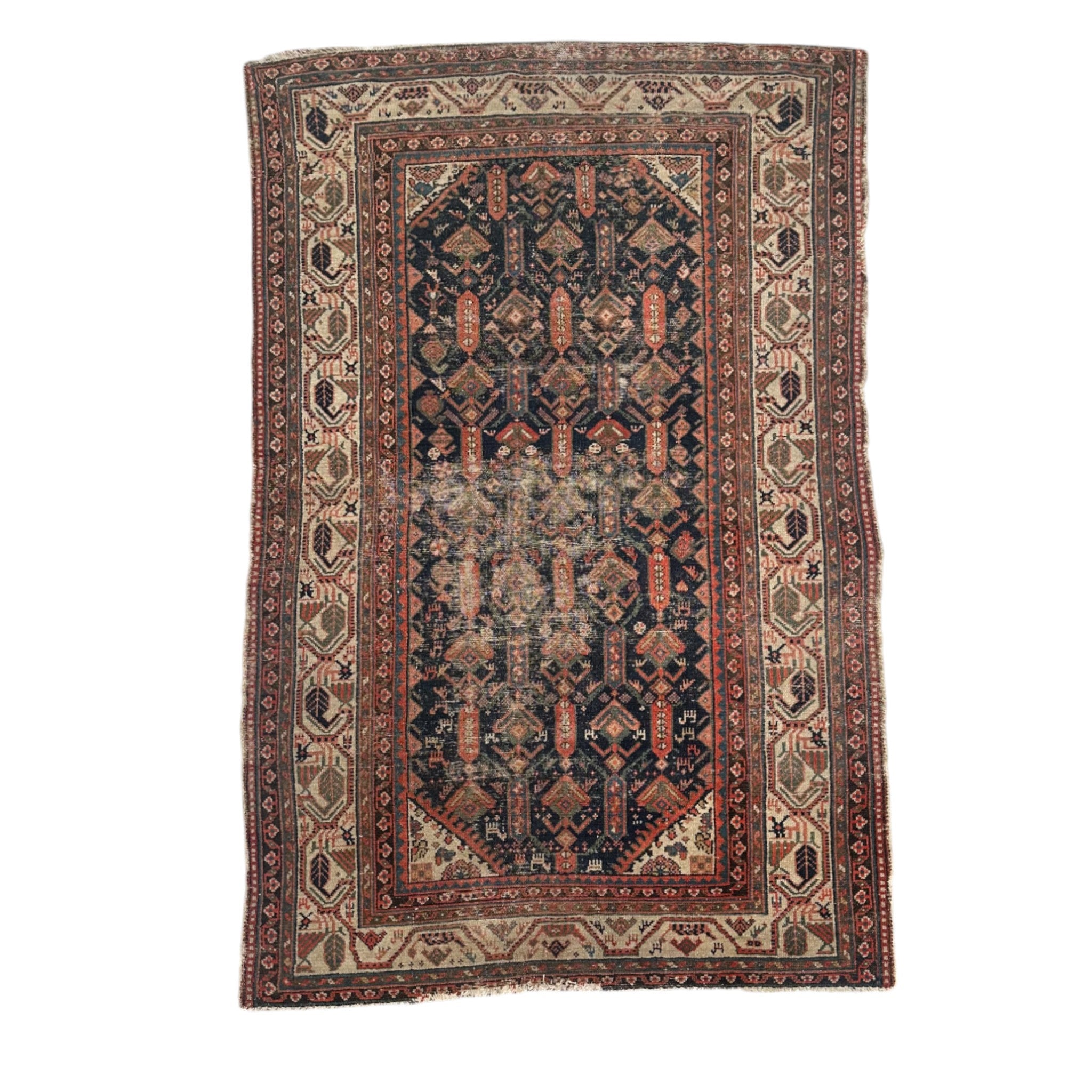 This vintage caucasian rug features a striking geometric pattern in rich tones of rust, indigo, and ivory. Woven by hand with wool, this piece shows beautiful age-related wear and patina, adding to its character and authenticity. A perfect statement for hallways or layered over larger rugs.