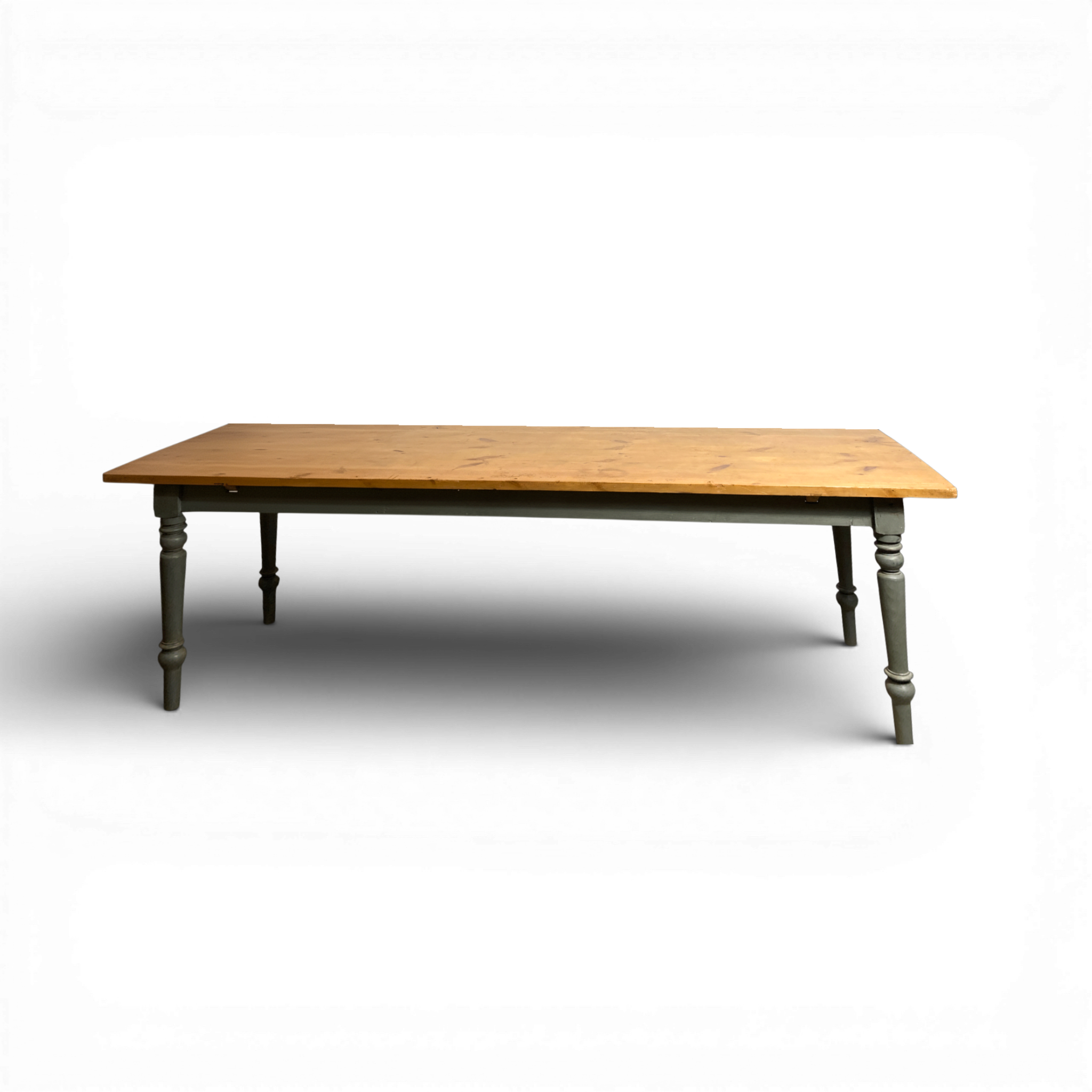 This 1950s vintage pine dining table features a generous plank top paired with turned legs painted in a muted green tone. Crafted from solid pine, the table showcases warm wood grain, softened edges, and age-earned wear that give it depth and character. The contrast between the natural top and painted base reflects mid-century European utilitarian design, making it a versatile piece for dining rooms, kitchens, or creative workspaces.