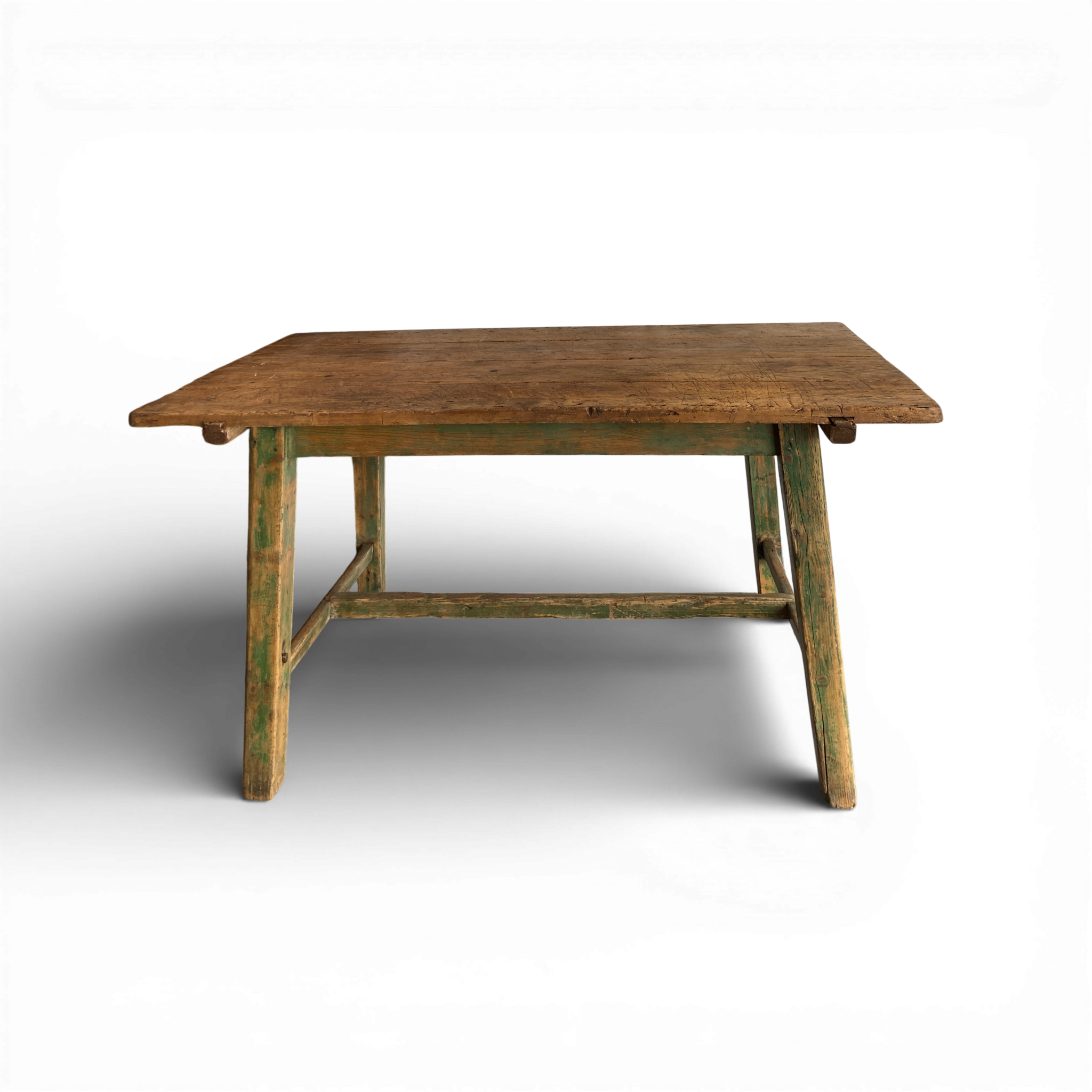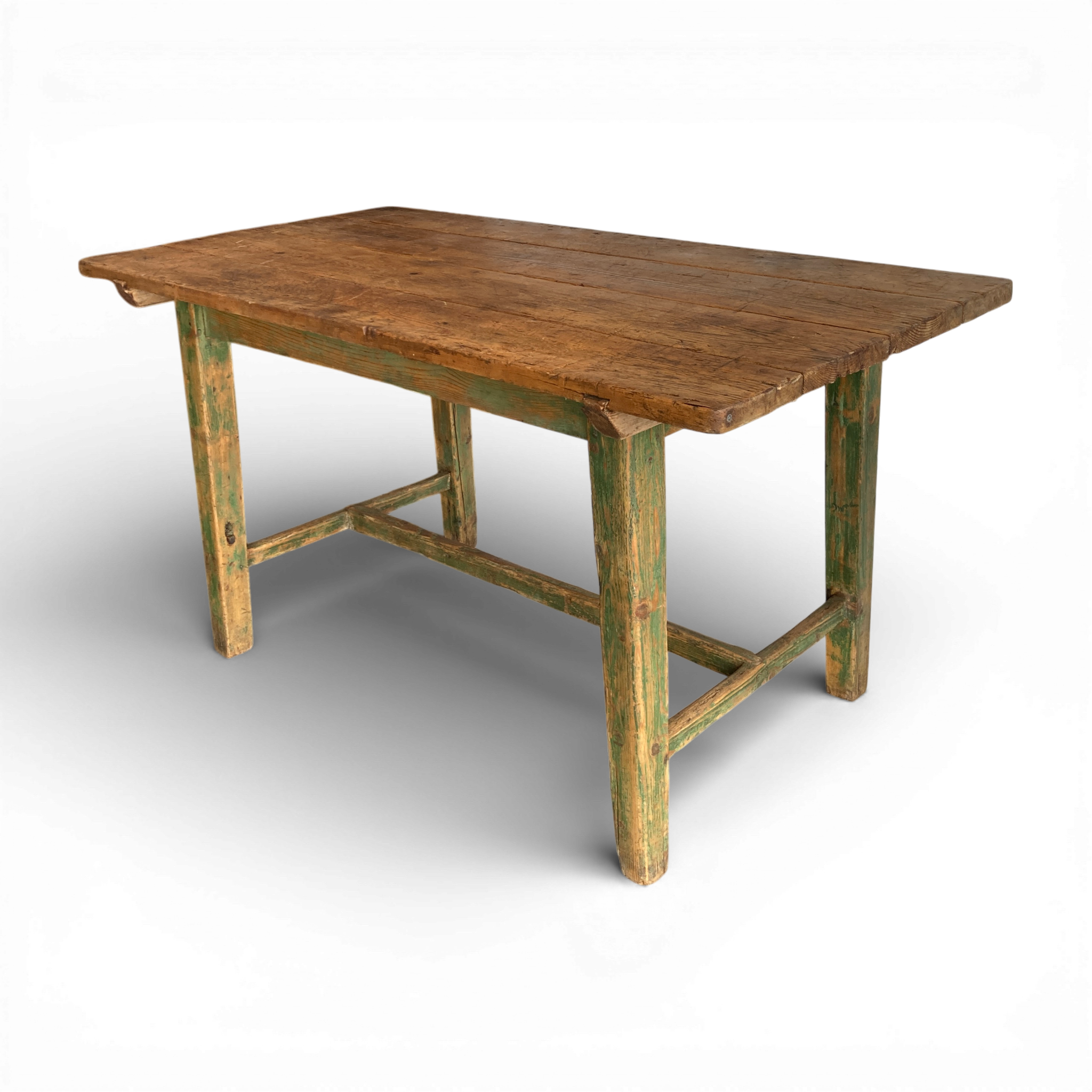 This 1950s vintage pine wood table originates from Budapest, Hungary. Featuring a simple, utilitarian form, the table pairs a solid pine top with charming green painted legs, reflecting mid-century functional design. The natural wood grain and gently worn painted base add warmth and character, making it a versatile piece for use as a kitchen table, workspace, or casual dining surface.