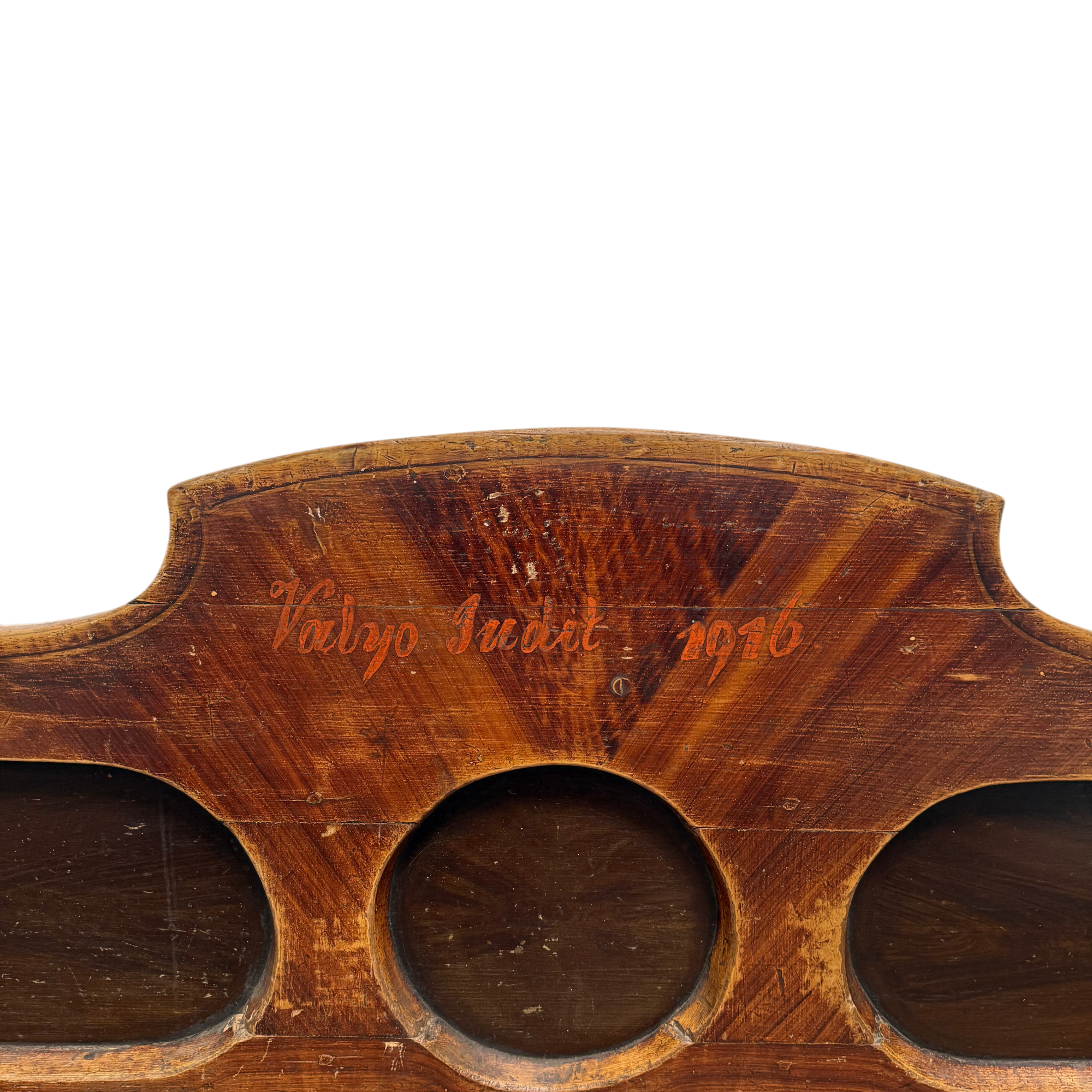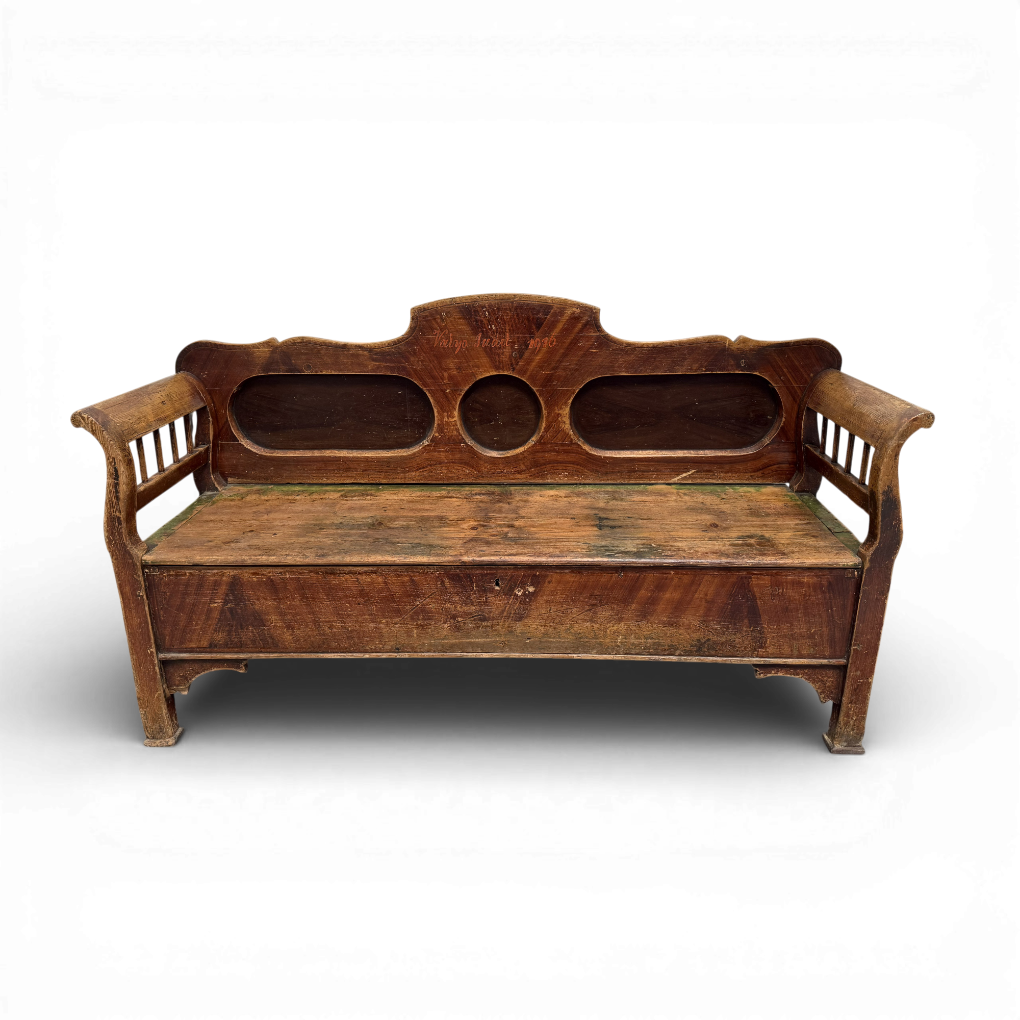 A striking early 20th-century Hungarian bench chest featuring a sculptural backrest and original painted inscription. Combining storage and seating, this piece reflects the intersection of rural folk furniture and Art Nouveau influence during the final years of the Austro-Hungarian Empire.