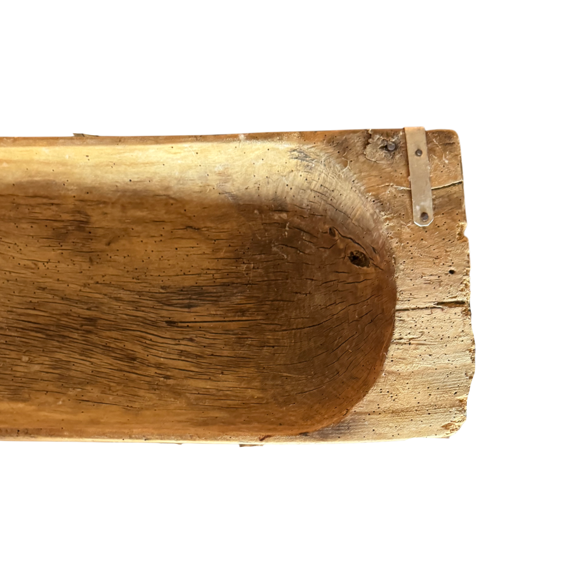 This 1890s antique oak dough bowl reflects the utilitarian beauty of late 19th-century craftsmanship. Hand-carved from solid oak, it features a richly aged patina, visible tool marks, and timeworn imperfections that speak to decades of use. Originally made for bread making, it now serves as a striking decorative object—perfect as a centerpiece, catchall, or sculptural accent with deep historical character.