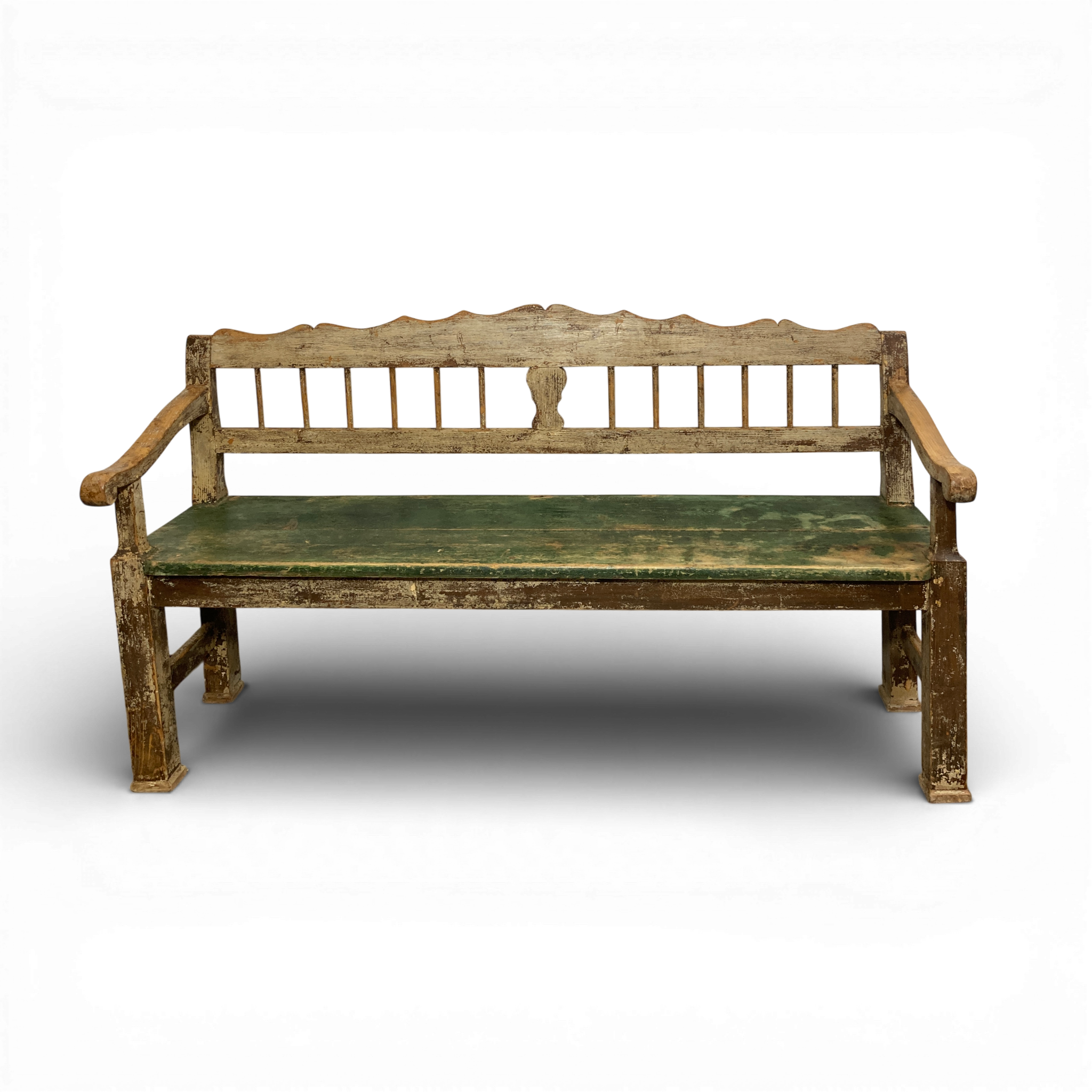 This 1950s vintage pine bench features a sturdy, utilitarian form with a slatted back and thick plank seat. Traces of original green paint remain across the surface, layered with wear, scuffs, and patina that speak to decades of use. Crafted from solid pine, the bench balances rustic charm with practical durability, making it a versatile piece for entryways, dining spaces, or at the foot of a bed.