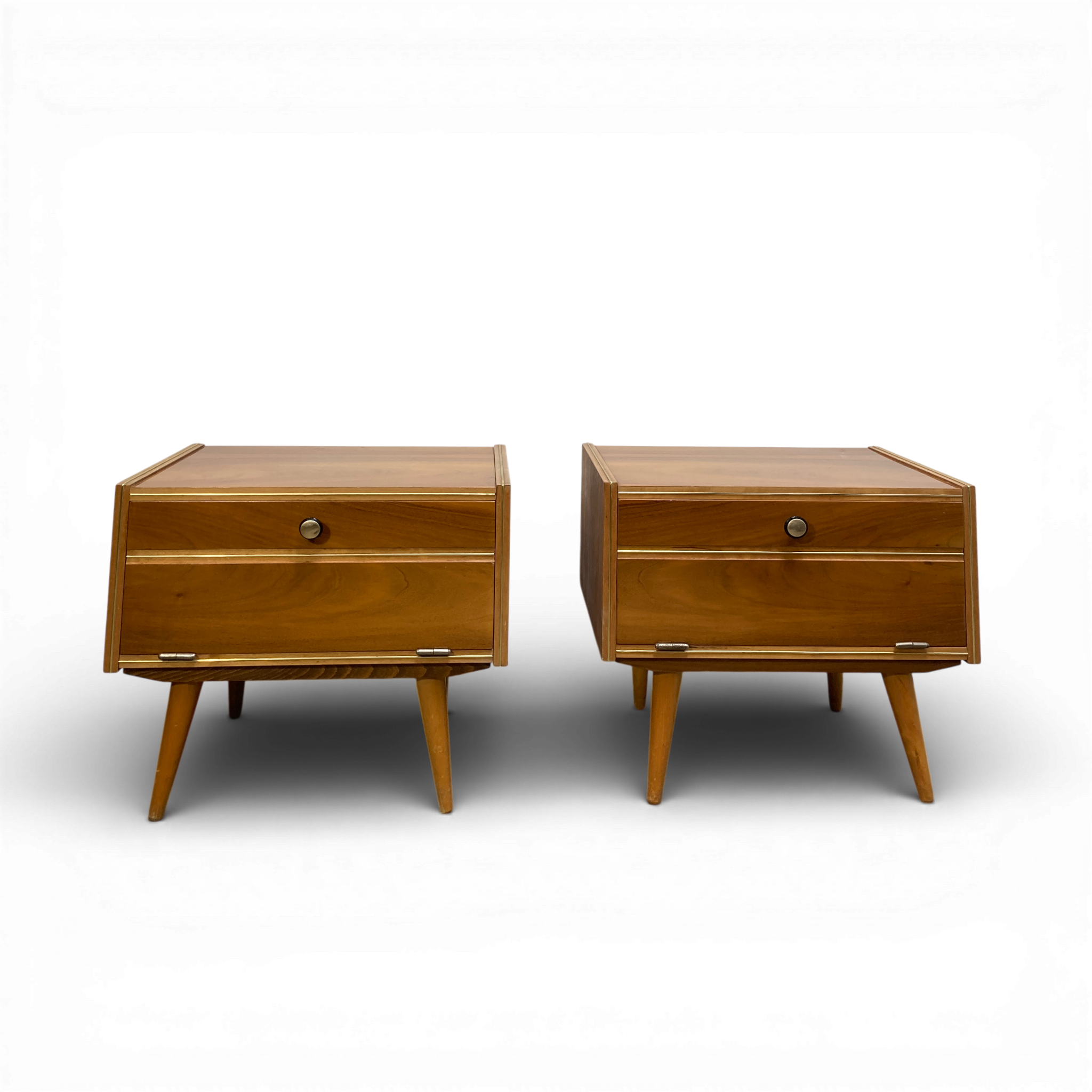 This pair of 1950s mid-century modern pine nightstands features clean lines, simple proportions, and warm natural wood tones. Crafted from solid pine, each nightstand showcases functional storage with understated detailing typical of postwar modern design. The minimalist silhouettes and aged patina make them versatile pieces, well-suited for both modern and layered vintage interiors.