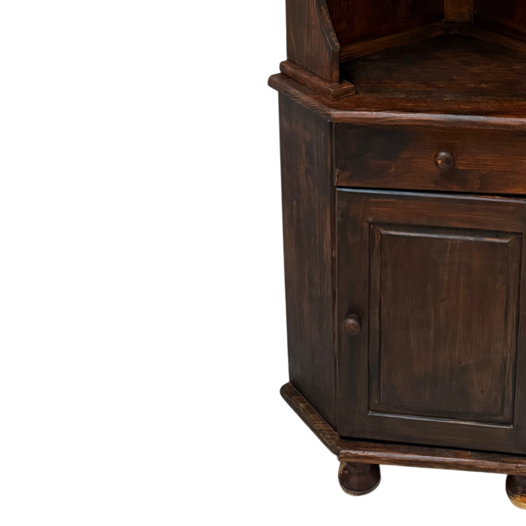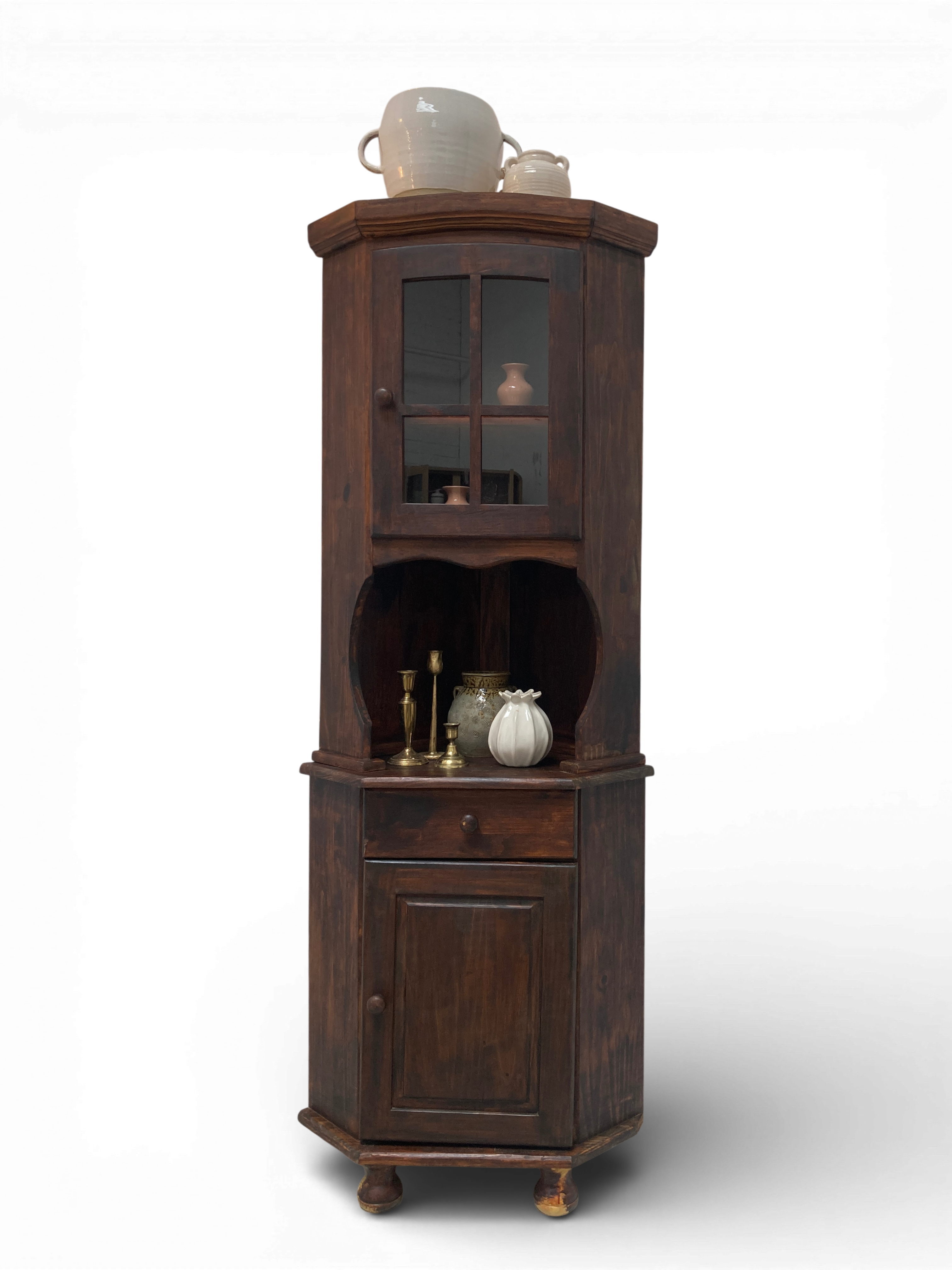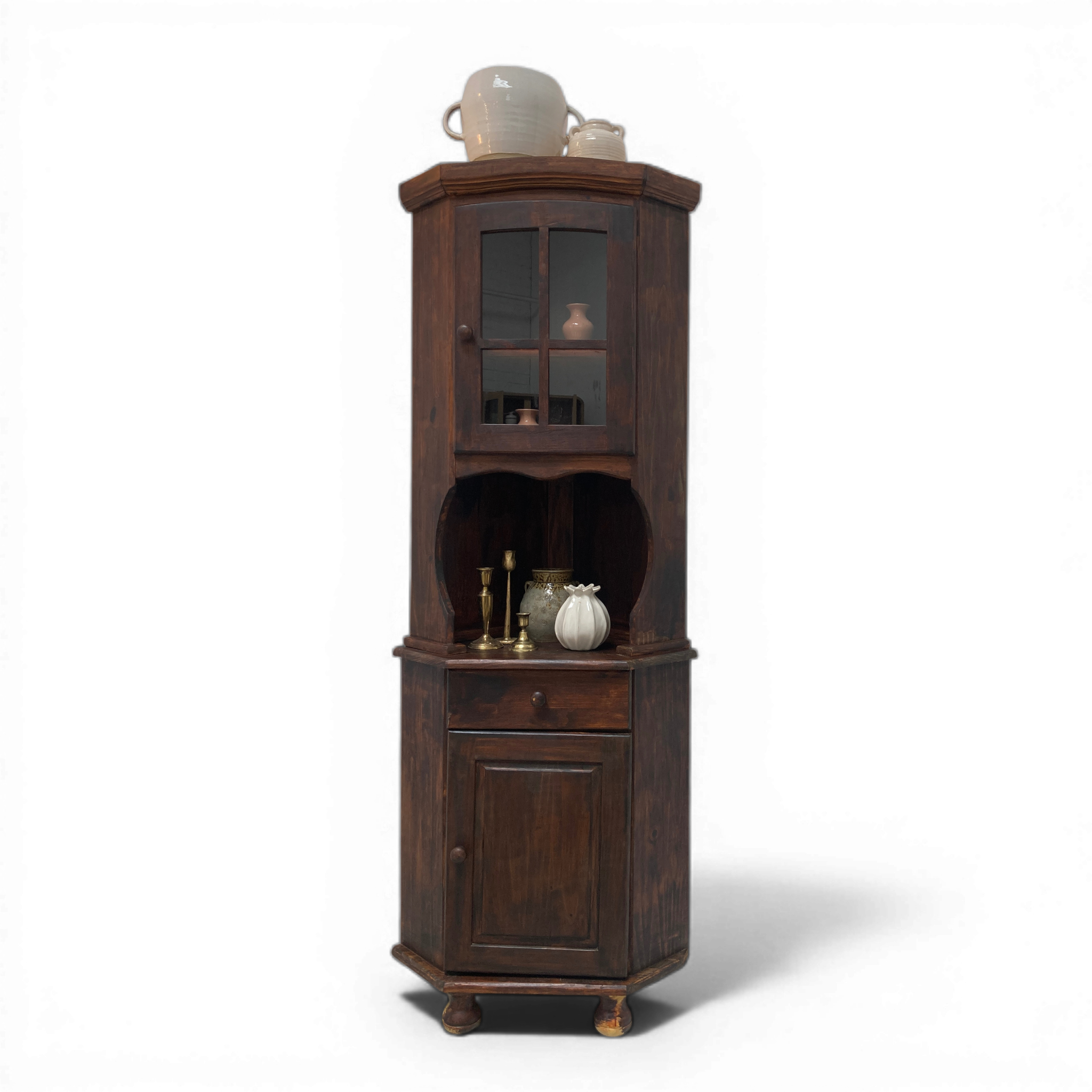 This 1970s vintage pine corner cabinet originates from Budapest. Crafted from solid pine, the piece features a tall, space-efficient silhouette with upper glass-front storage, an open display niche, and enclosed lower cabinet. The warm wood tone and simple lines reflect Central European vernacular design with subtle rustic character, making it an ideal functional accent for kitchens, dining areas, or layered interior vignettes.