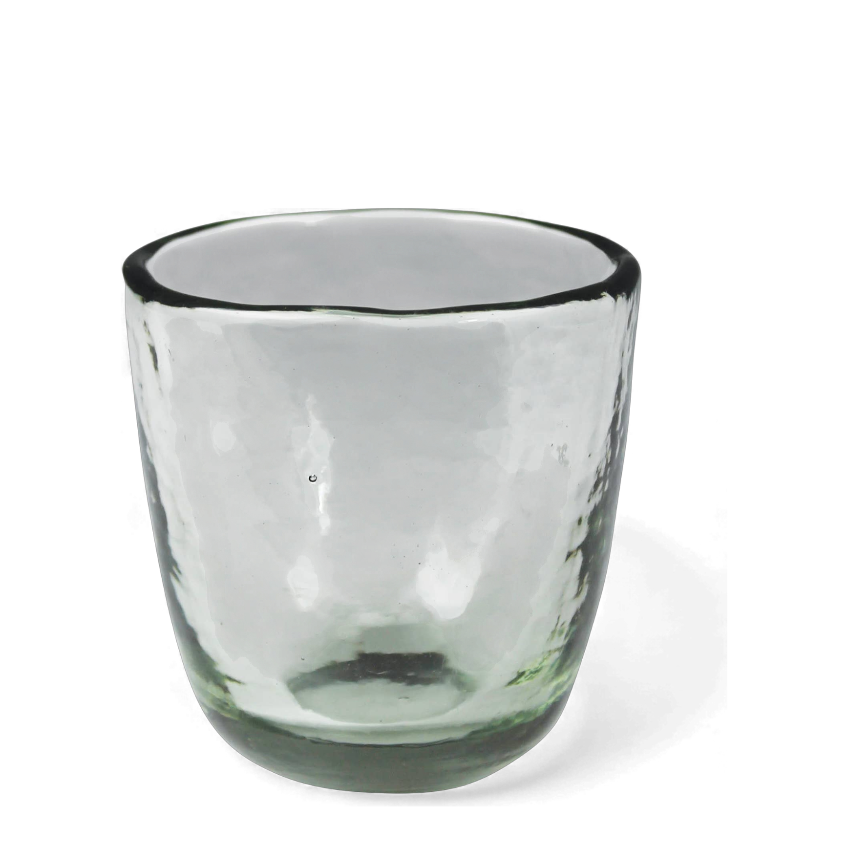 This casual water glass is hand made of recycled glass lending a unique characteristic to each piece. Thick glass with a subtle hammered texture, this fuss-free drinkware feels as good in the hand as it looks on a shelf.