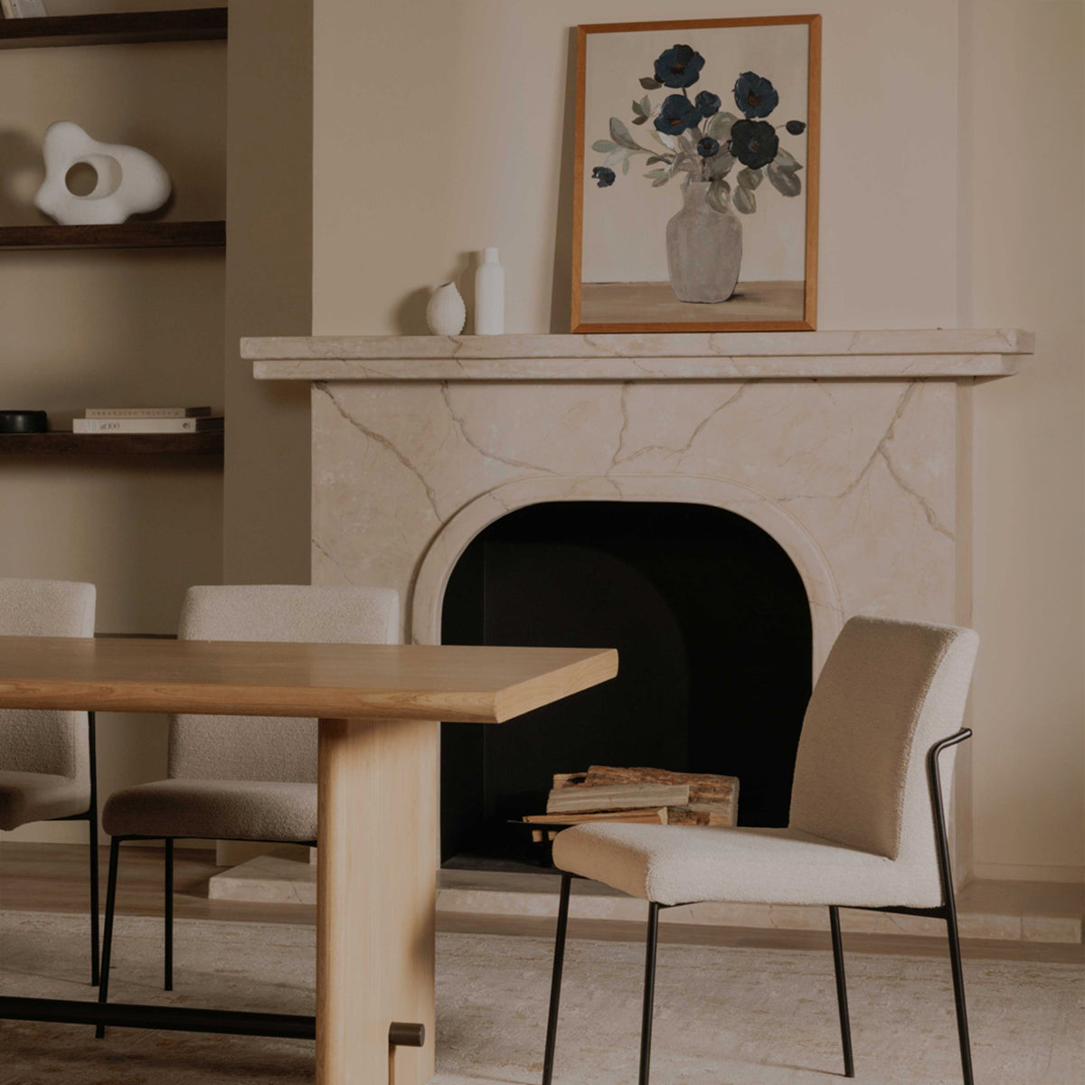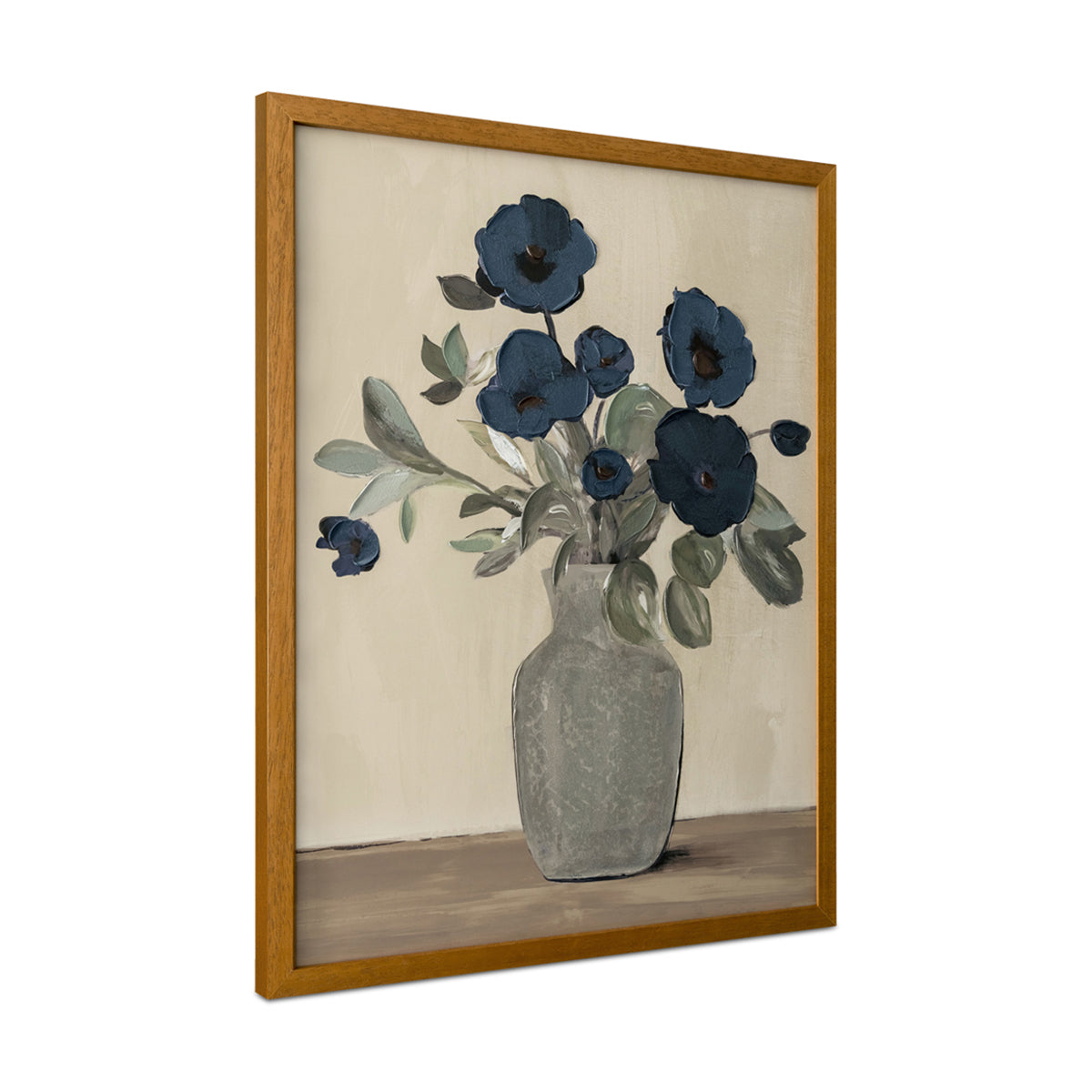 A poetic symphony of tranquility, the Sentiment framed painting is an exquisite floral still life that captivates with muted blues and greens, anchored by rich navy blooms. Rendered in acrylic on canvas and framed in solid wood, this piece adds organic texture and serene sophistication to any space.
