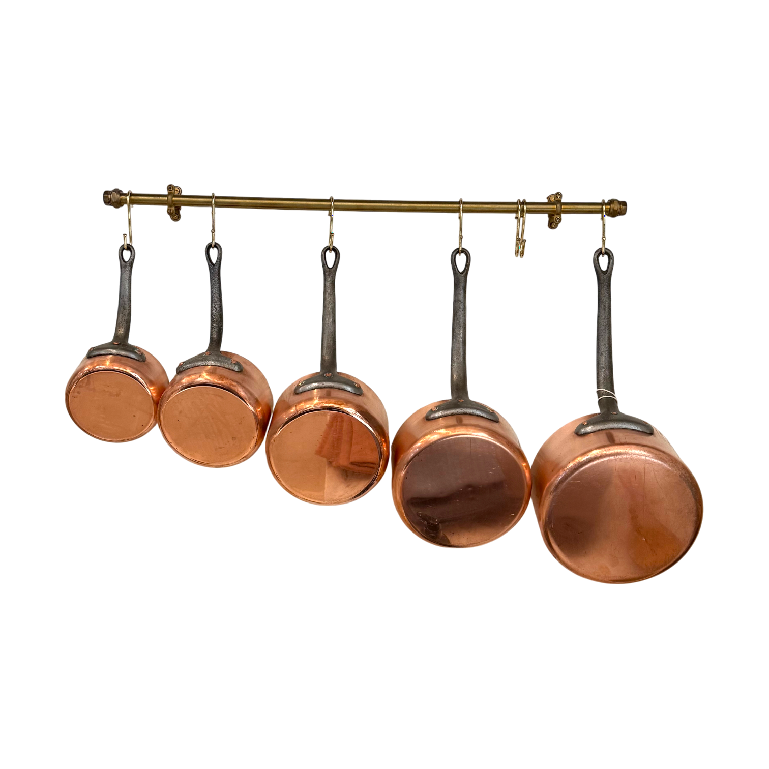 Timeless and elegant, this Vintage French Copper Pots Set of 5 brings warmth and sophistication to any kitchen. Crafted with solid copper and brass handles, these heirloom-quality saucepans develop a rich patina over time. Perfect for display or daily use, they embody the charm of classic French cookware.
