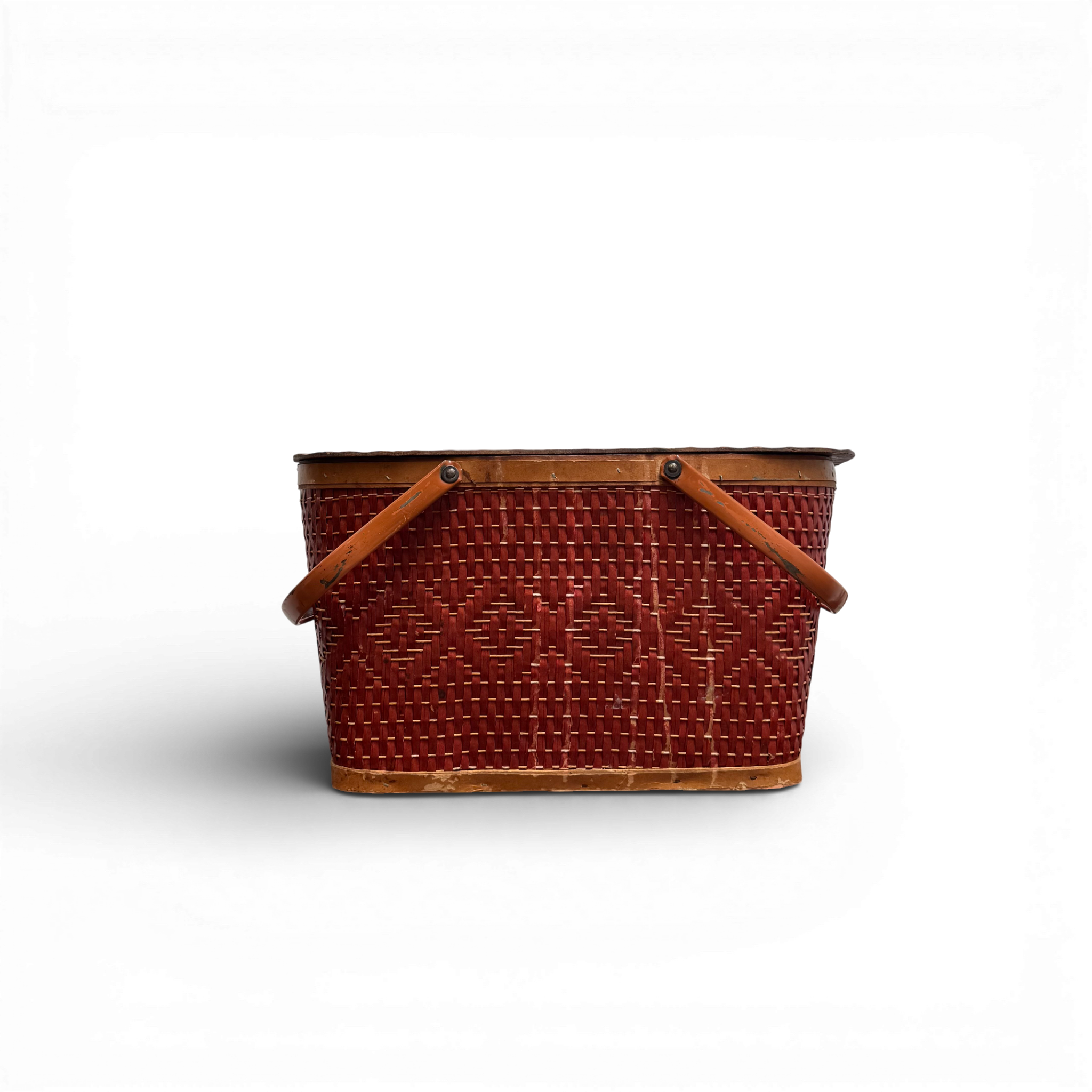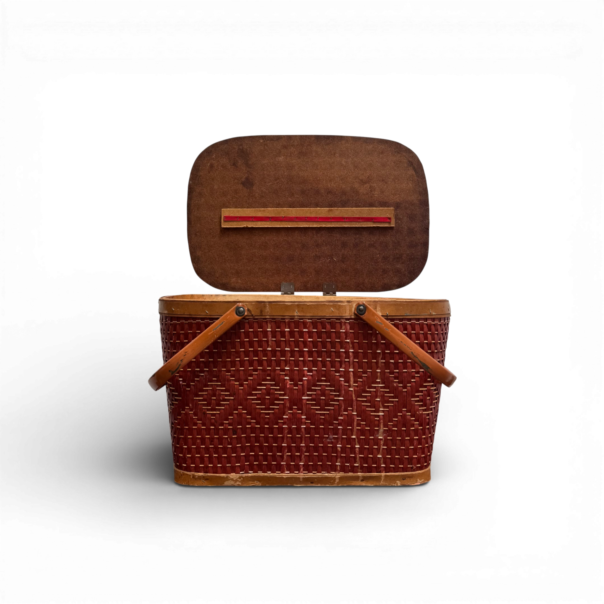 This vintage woven picnic basket features a rich reddish-brown wicker body with a repeating geometric pattern and warm wooden trim. Leather-wrapped handles attach at the sides, while the hinged wooden lid opens to reveal a clean, spacious interior with charming period details. Showing gentle wear consistent with age, this piece offers both practical storage and timeless character—perfect for display, linens, or as a decorative accent with classic Americana appeal.